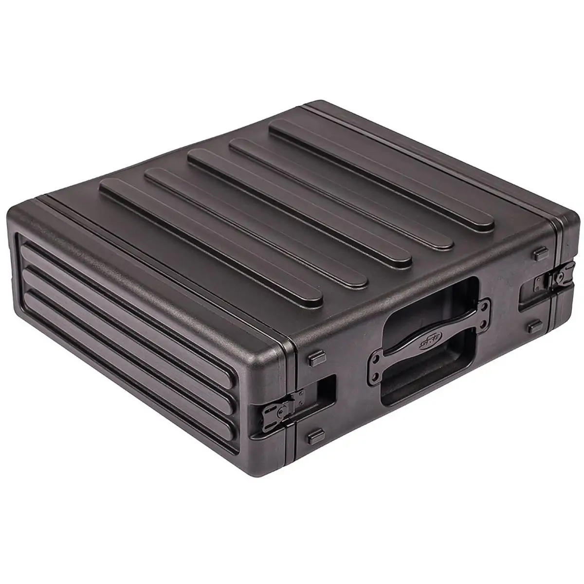 The 1SKB-3RU features a recognizable exterior bar design that signifies the rack size on the front and rear covers and provides interlocking capabilities for secure stacking with SKB Roto Racks and Roto Shallow Racks. Other standard features include recessed steel Mil-Spec black twist latches, heavy-duty flush handles, and front and rear rack rails with a rack depth of 17.50 inches (44.70cm) so gear can now be mounted front and rear with the supplied rackmount clips.