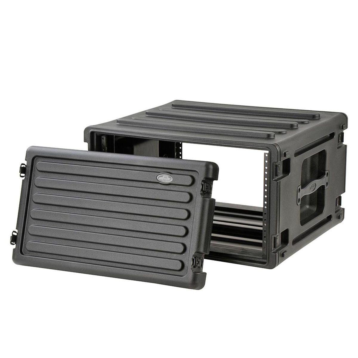 SKB Roto Racks represent the ultimate in American technology with their roto-molded tough shells, front and rear lids, recessed heavy-duty twist latches, molded in handles, and shock absorbing rubber feet for solid stackability. The unique moulded-in unbendable valance and steel threaded rails with self tapping screws make the SKB 1SKB-R6U Roto Rack durable and convenient to use.
