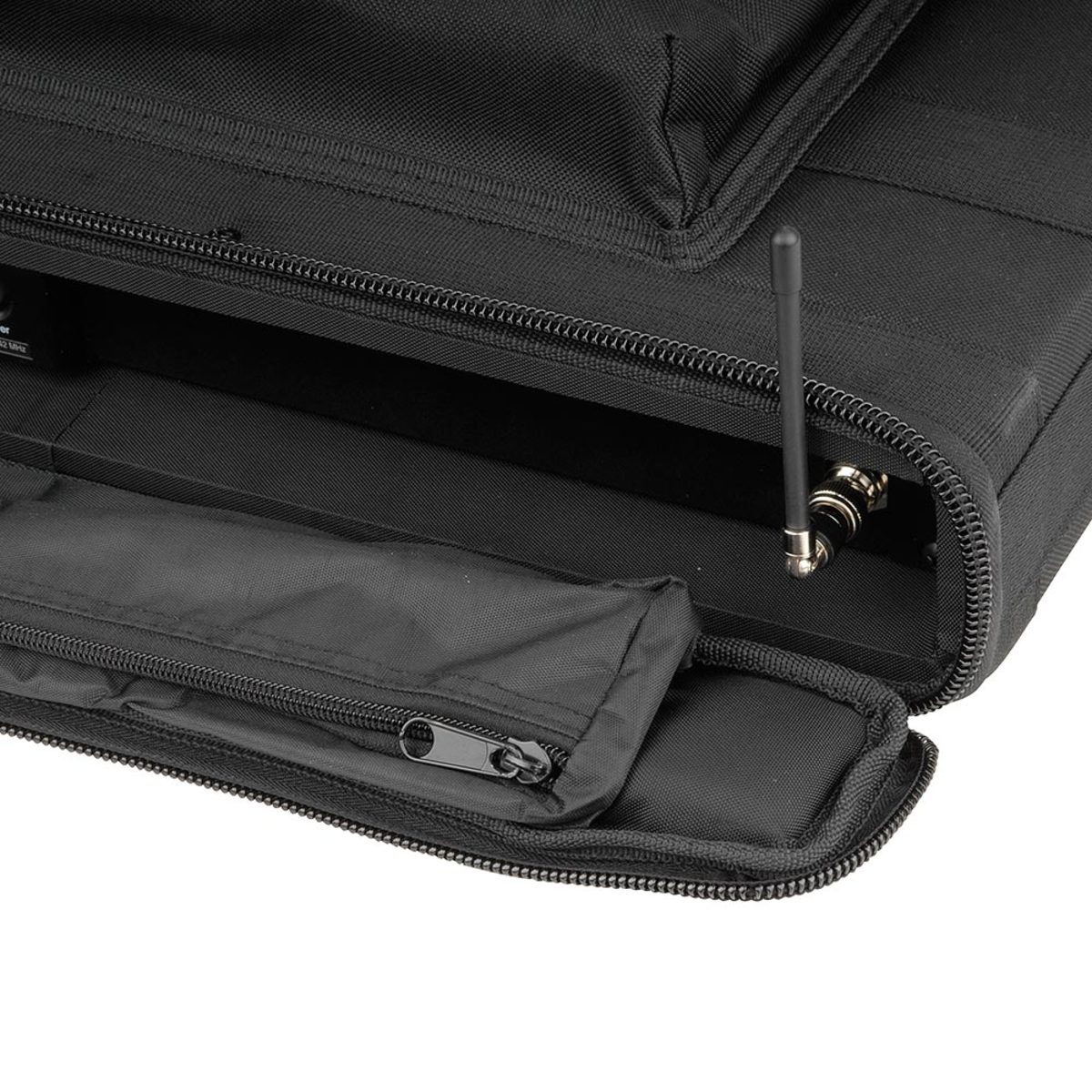 The 14.5” (360mm) depth (front rail to back flap) provides plenty of room for the most popular wireless systems. The padded front and back lid has heavy duty zippers that allow for the flaps to open fully and fold underneath. A zippered pouch on the inside front flap provides excellent storage of wireless mic antennae.