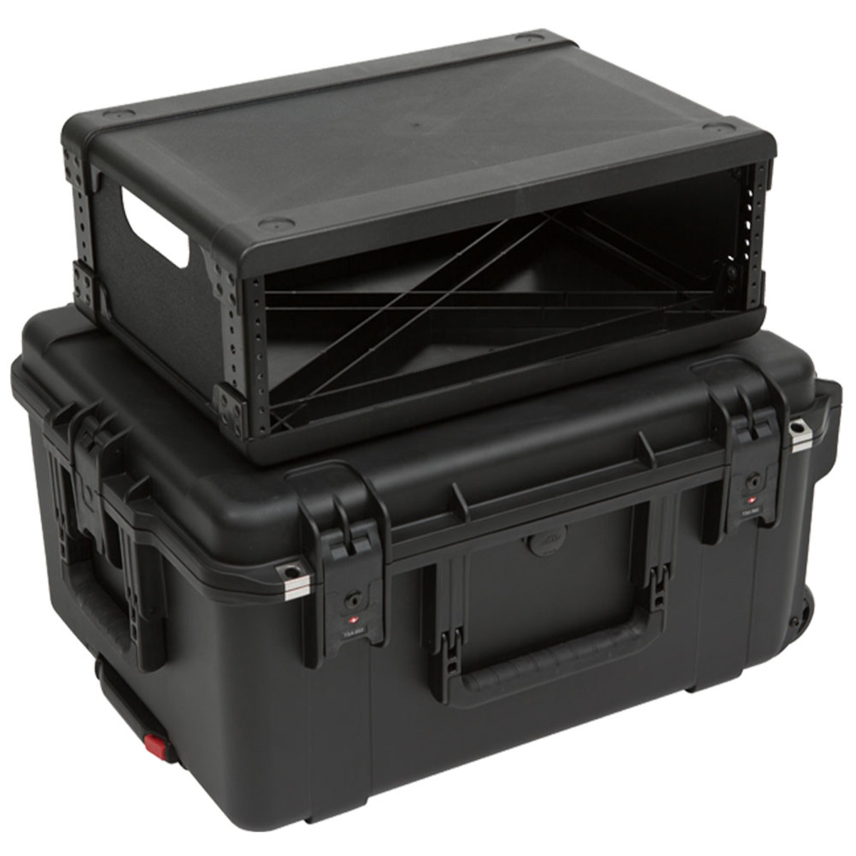 At less than half the weight of standard shock racks, SKB Fly Racks feature iSeries Watertight injection molded cases that are under 62 linear inches to keep from being oversized—the perfect solution for flying or shipping delicate equipment. Convenient in-line wheels and a push button release pull handle provides easy transport.