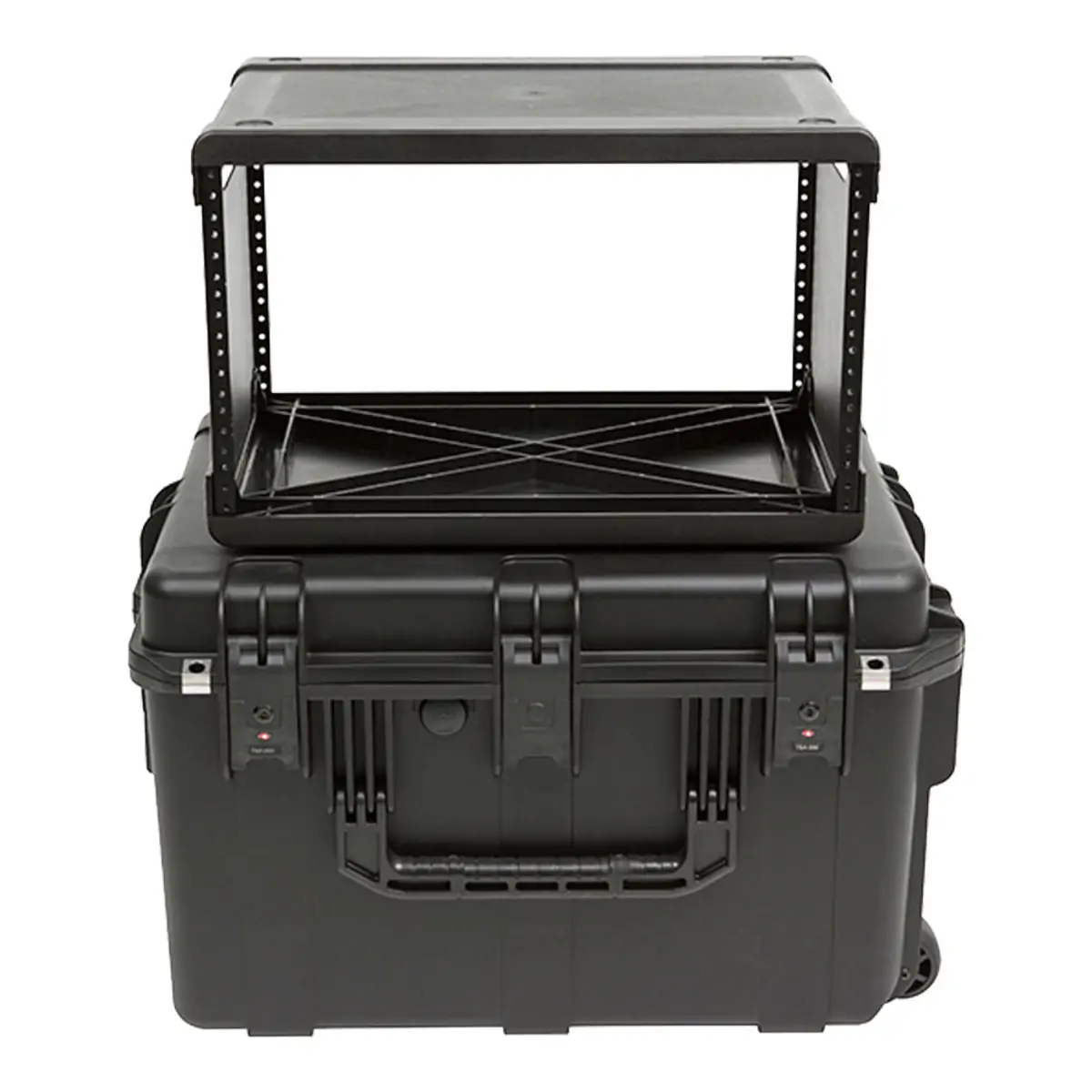 At less than half the weight of standard shock racks, SKB Fly Racks feature iSeries Watertight injection molded cases that are under 62 linear inches to keep from being oversized—the perfect solution for flying or shipping delicate equipment. Convenient in-line wheels and a push button release pull handle provides easy transport.