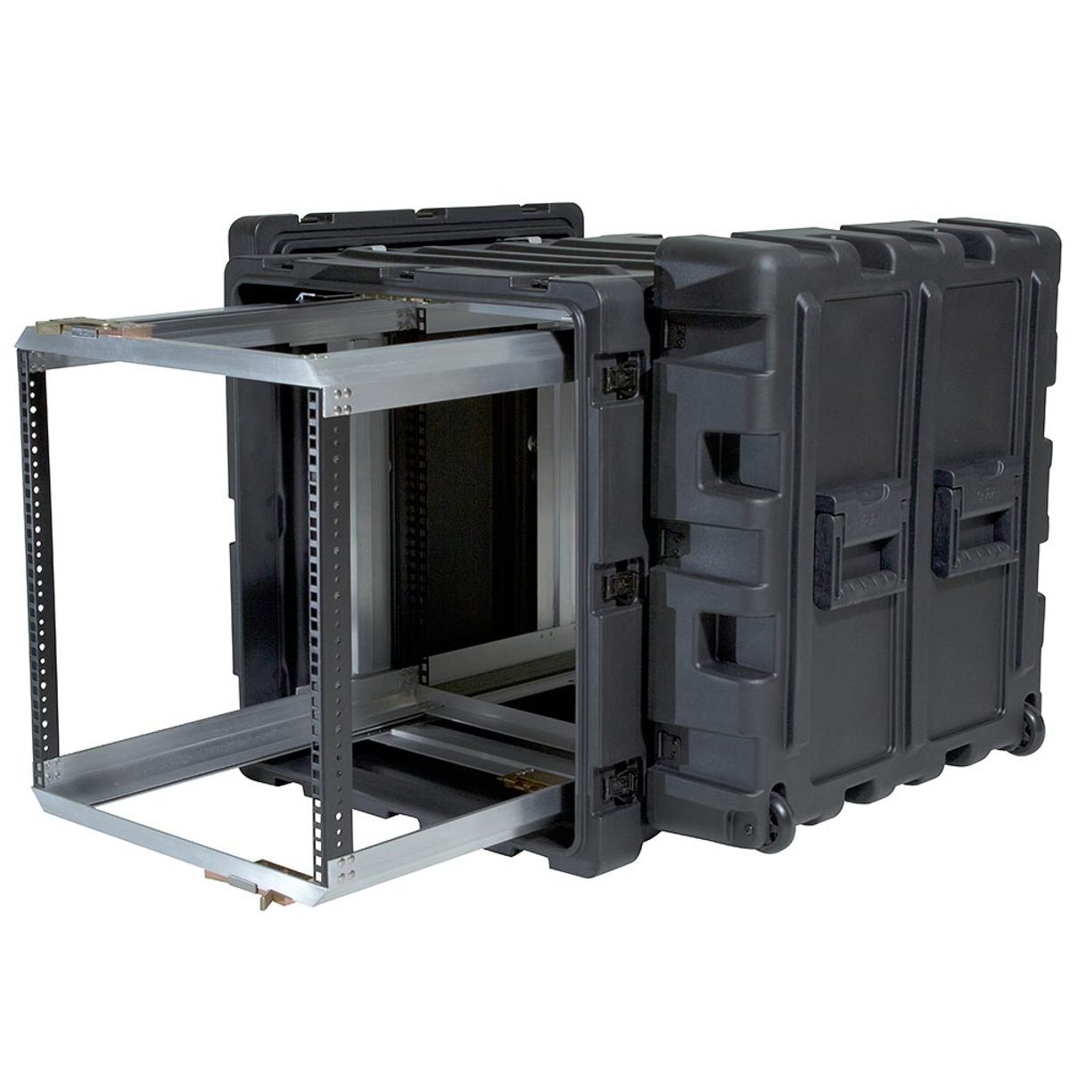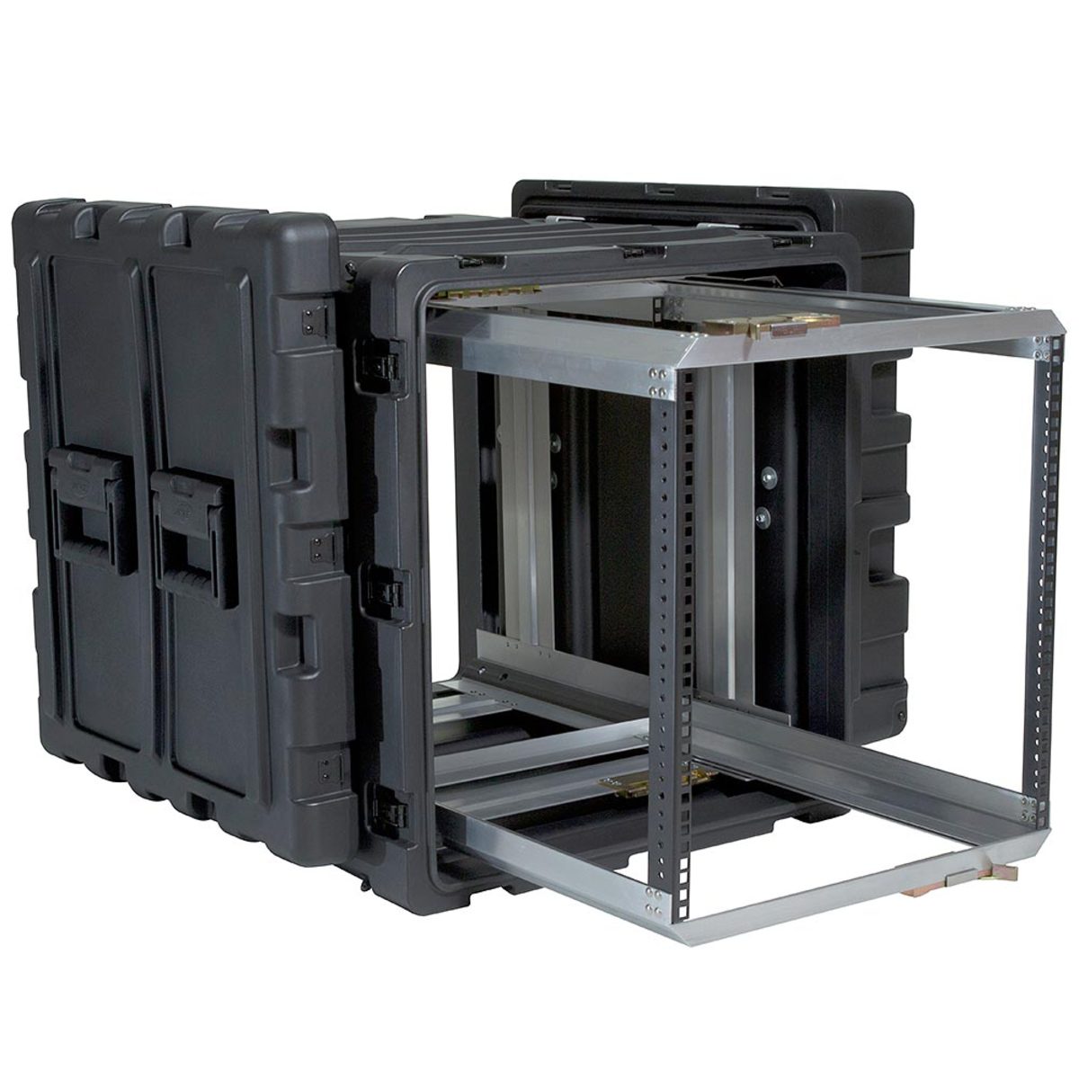 The 11U SKB 3RR Series represents the pinnacle of SKB rack cases. These shock rack cases are tougher, lighter, stronger and better than any other rack case out there in the market. The removable rack option saves time and money by eliminating the hassle of dealing with cables and screws in small, limited spaces—just take the rack out, change the equipment, and slide the rack in again. These cases are also featured-packed for ease of use, with convenient integrated wheels (24” and 30” models only), lid hangers, couplings straps, and more.
