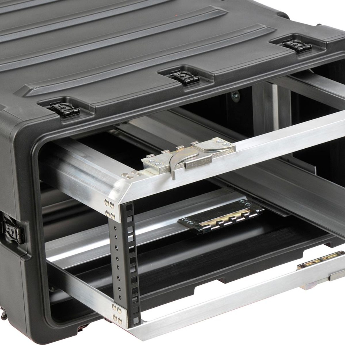 Moulded of LMDP Linear Medium Density Polyethylene plastic that meets or exceed MIL-STD 810G standards and includes 8 elastomeric shock absorbers which allows a standard payload range of 40 to 150 pounds. Optional extended payload range of 160 to 300 pounds can be accommodated as a special order option. These 3RR Series Removable Racks are 30” deep from rail to rail with a standard 19” rack width per ANSI/EIA-310-C specification and feature square-hole rack rails to accommodate either #10-32 US standard, or 6mm International standard cage nuts which are supplied with the cases.