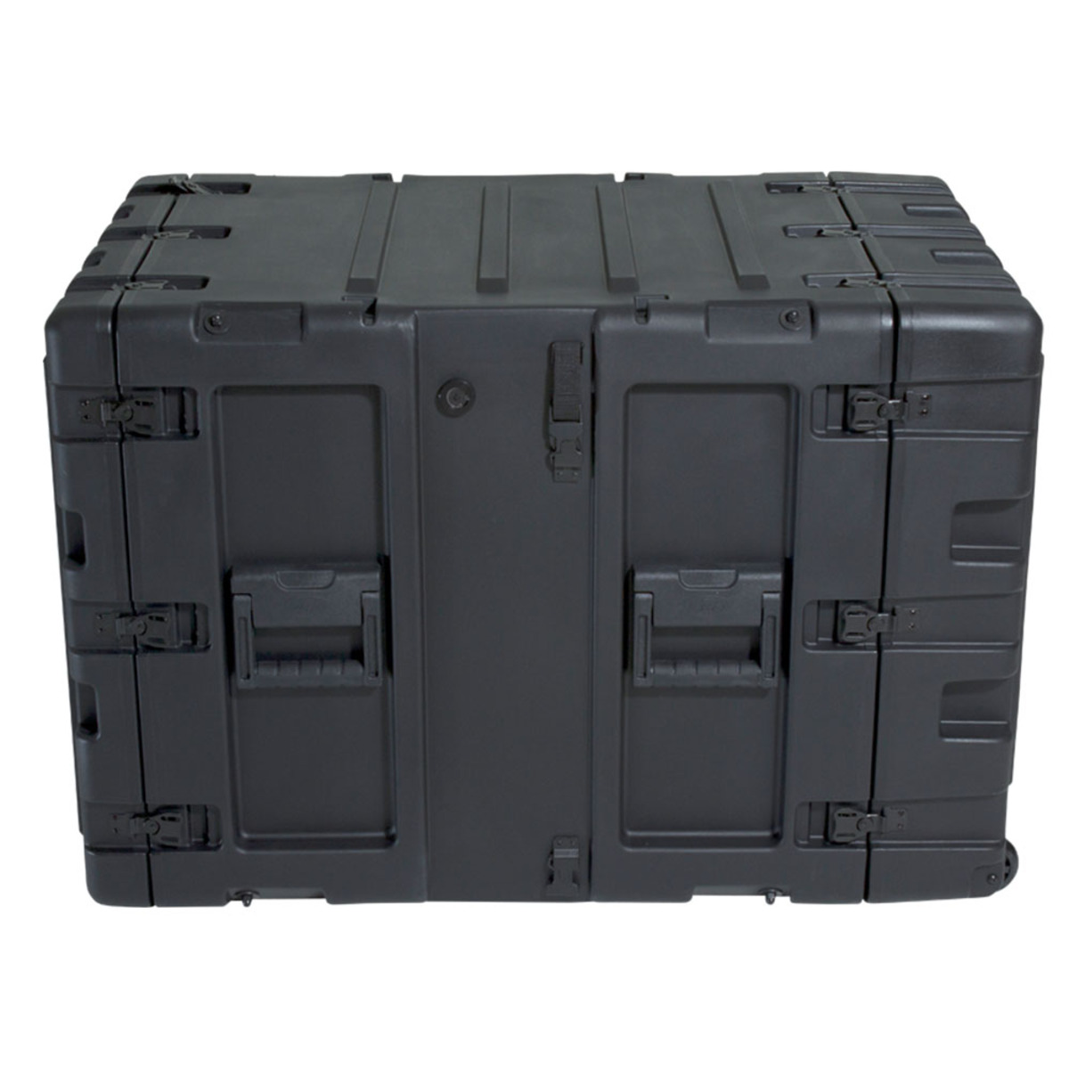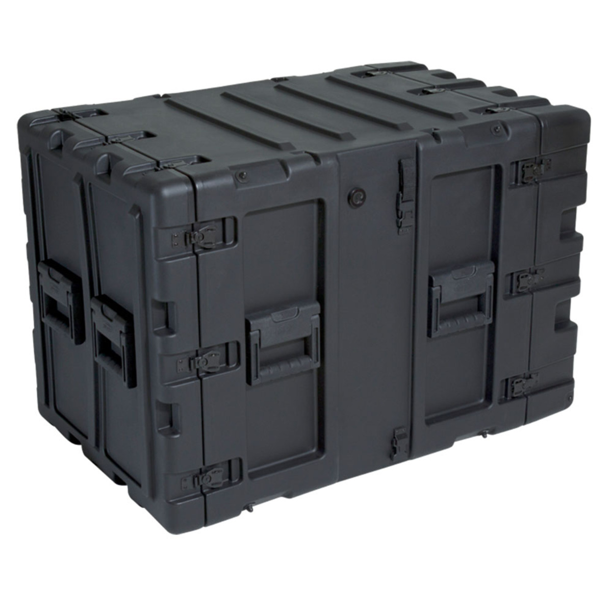 Molded of LMDP Linear Medium Density Polyethylene plastic that meets or exceed MIL-STD 810G standards. The rugged roto-molded shell ensures industry leading strength and impact resistance. The standard COTS (commercial off the shelf) case comes with a 2” deep front lid and a 5” deep rear lid to accommodate rack gear that is longer than 24”, and edge casters to allow convenient case transport. Molded-in stacking ribs and lugs are designed to stack with competitive manufacturers cases. Black powder coated stainless steel hardware are recessed for protection is standard as well as 8 comfort grip spring loaded lift handles which allow for easy movement. An automatic pressure relief valve is another standard feature along with gasket sealed lids that include convenient lid hangers to store your lids when your equipment is in operation. Coupling straps are included for securing the racks together when stacked.